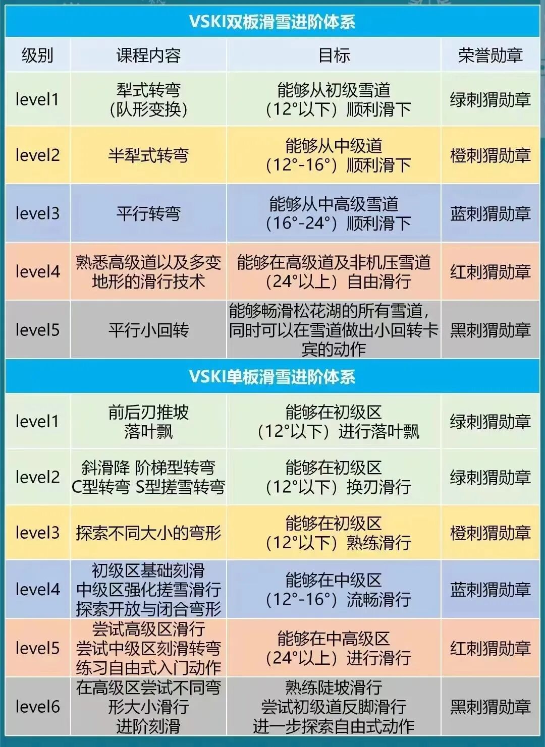 5级滑雪教学体系 1-5级的滑雪进阶教学与评价体系。基于“儿童青少年认知、情绪、体格(CAP)成长规律模型,开发出专业的儿童滑雪培训体系,最后依照实际水平颁发滑雪认证证书和滑雪勋章。