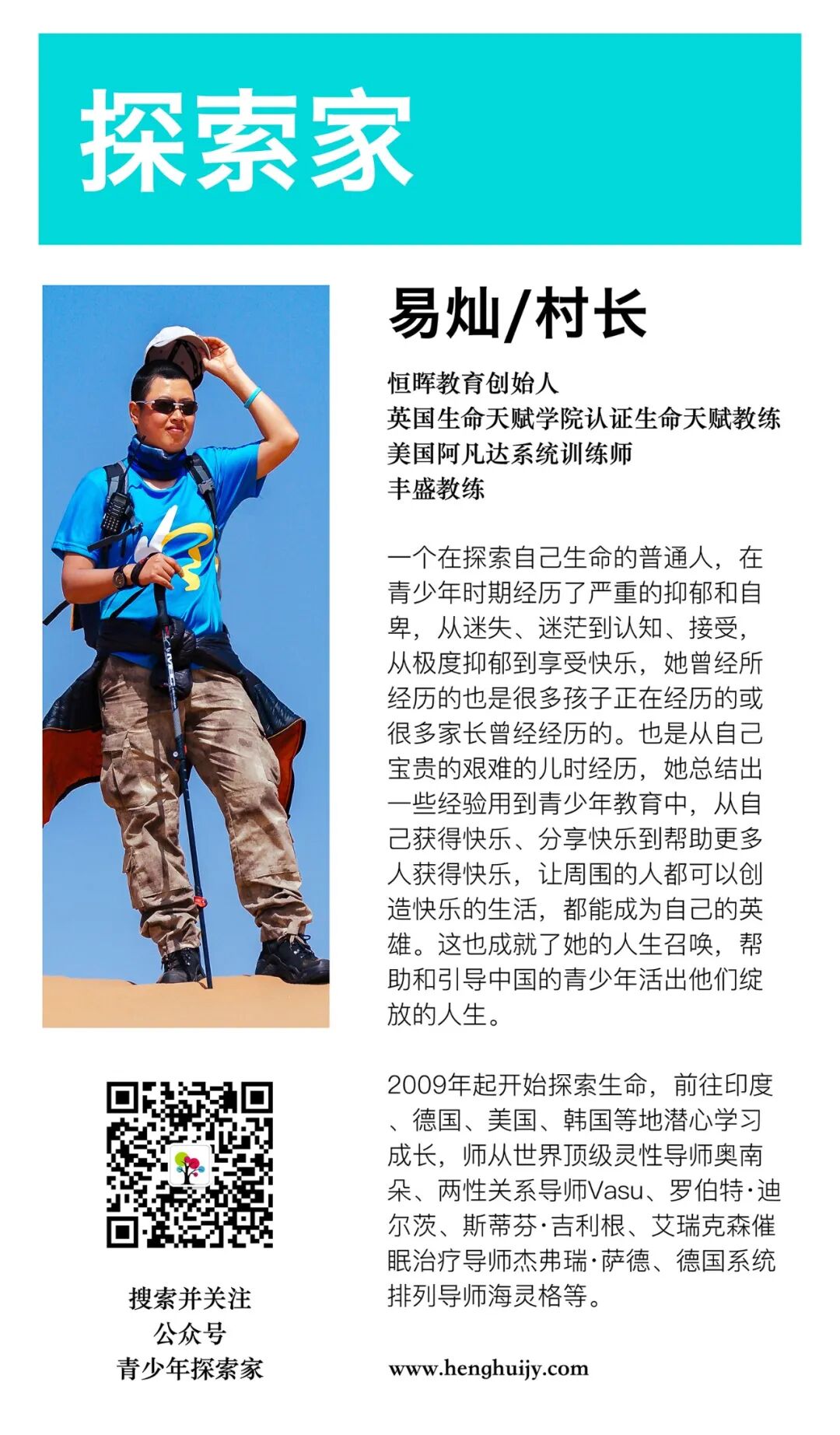 谁是恒晖探索家? 融合11年心理学探索 8年青少年教育实践 由内而外的帮助青少年成长和改变 恒晖探索家的愿景: 用爱服务人,帮助青少年从内在改变到外在改变,让世界更美好 恒晖探索家的使命: 培养有爱、有愿景、有能力的新一代世界公民 恒晖探索家的理念: 让青少年成为自己命运的创造者,共同创造一个理想的世界 ❤️