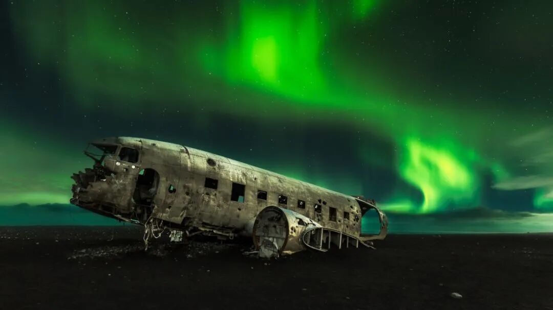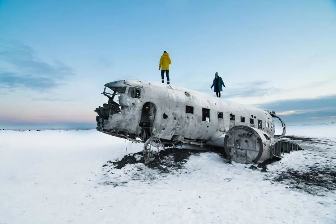 #小众景点飞机残骸 一架迫降在黑色沙滩飞机残骸, 一片荒芜而广袤的黑沙滩上,残破的粗糙金属机身在黝黑砂石的映衬下更显凄美、神秘与震撼, 一幅犹如末日般的风景,完美诠释了冰岛的孤绝异世感,吸引了许多冰岛本地及世界各地的摄影师争相造访。