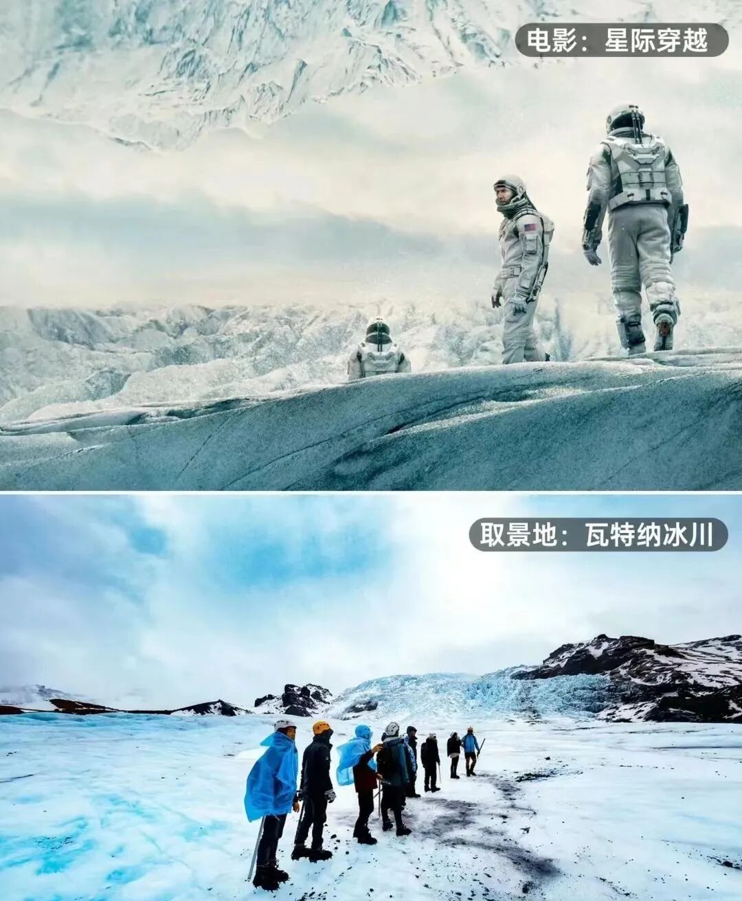 #冰岛,众多大片电影拍摄取景地 冰岛被称为“地球上最像外星球的地方” 神秘的自然美,是许多科幻电影的最佳取景地电 【星际穿越】 取景地:瓦特纳冰川 电影中的冰冻星球和米勒水星,都在这里拍摄的,欧洲幕大的冰川,仅次于南极大陆冰川和格陵兰冰川 【权利的游戏】 取景地:瓦特纳冰川、草帽山 冰岛取景地很多,比如艾丽娅和猎狗Hound在维斯特洛 颠沛流离的场景,绝境长城等场景都是这里拍摄的 【普罗米修斯】 取景地:黛提瀑布 影片开头空旷的荒原及奔腾的瀑布配上冷色调,构成了电影中史前地球的景色 【星级迷航】 取景地:黑沙滩 ■外星球的海,取景地正是冰岛的黑沙滩,黑色的沙滩与 奇异的礁石,犹如外太空一般黑暗又空寂 【变形金刚4:绝迹重生】 取景地:塞里雅兰瀑布 变形金刚造访了恐龙时代的地球,这里设定为恐龙的栖息地